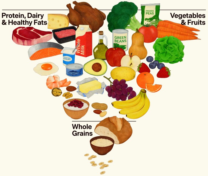 - The New Pyramid—The latest update includes images of an inverted pyramid that puts meats, cheese and vegetables in the widest part at the top, flipping a long-standing visual of the American diet and shifting away from the circular MyPlate guidance. The New Pyramid is meant to help Americans eat real, whole foods more consistently. It prioritizes nutrient-dense food and reduces reliance on highly processed products. This flexible framework is designed to guide better choices rather than dictate specific meals.